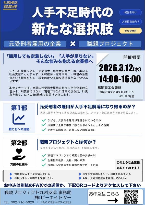 2026年3月12日、福岡商工会議所にて「人手不足時代の新たな選択肢 ― 元受刑者雇用の企業 × 職親プロジェクト ―」セミナーが開催され、企業関係者など約30名の方にご参加いただきました。